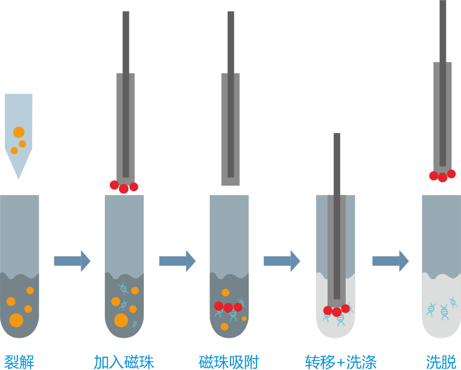 洗脫:由于在上一步中經過了較大體積的乙醇,在正式洗脫磁珠之前通常會經過“晾干”,充分利用乙醇的易揮發性,避免乙醇的殘留影響后續的實驗。當乙醇被去除,核酸分子恢復親水性,在弱堿性的洗脫液中,核酸被輕易地溶解,從而從磁珠上被解放出來。